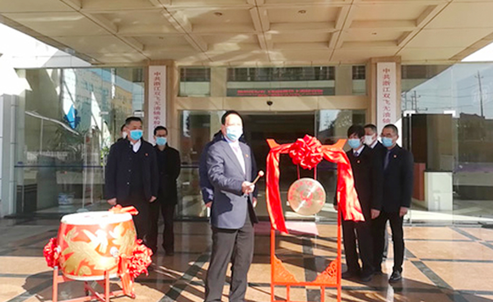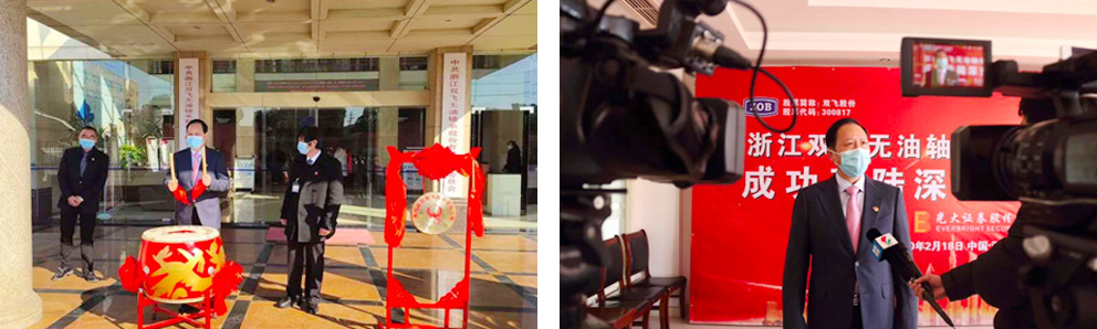為防疫需要,根據(jù)證監(jiān)會的要求,雙飛股份并未安排深圳舉行掛牌敲鐘儀式,而只是在公司舉行簡單的上市慶祝活動,嘉善縣干窯鎮(zhèn)為雙飛股份送來了一面鼓一面鑼,以祝賀企業(yè)上市成功,鼓勵企業(yè)以上市為契機,擂響沖鋒戰(zhàn)鼓,全力以赴抓復工。公司高管在董事長周引春的帶領下,敲鑼打鼓慶賀上市。